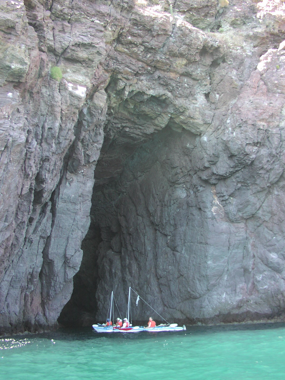 Swell-driven currents swirling around submerged rocks make manoeuvrng tricky as a pair of intrepid paddlers enter a sea cave.