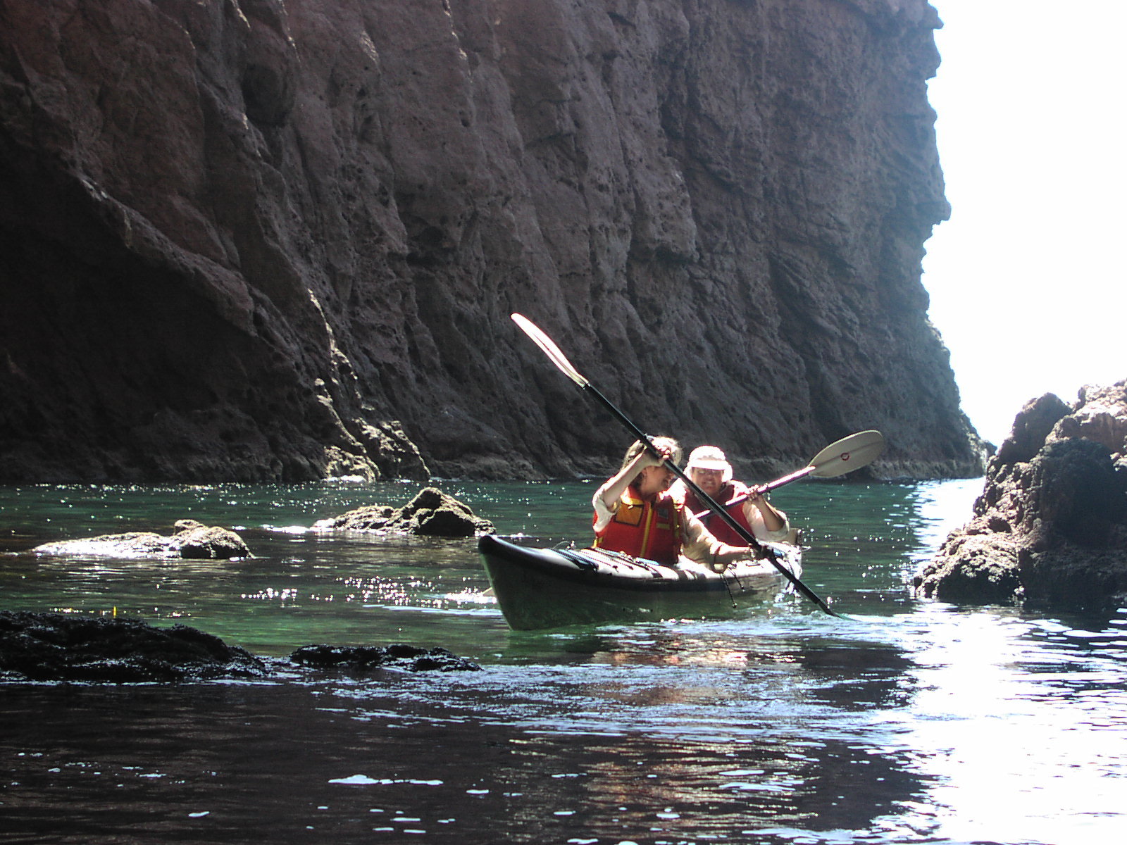 Kayaking is not blue-water sailing: we want to be among the reefs and shallow areas. Here, in the clear water, we can see schools of fish, watch birds diving for their dinner or resting on the cliffs, and playwith the waves and currents. And the rocky coast of the Sierra el Aguaje is the best place in all of Sonora to get our blades wet and have some fun.